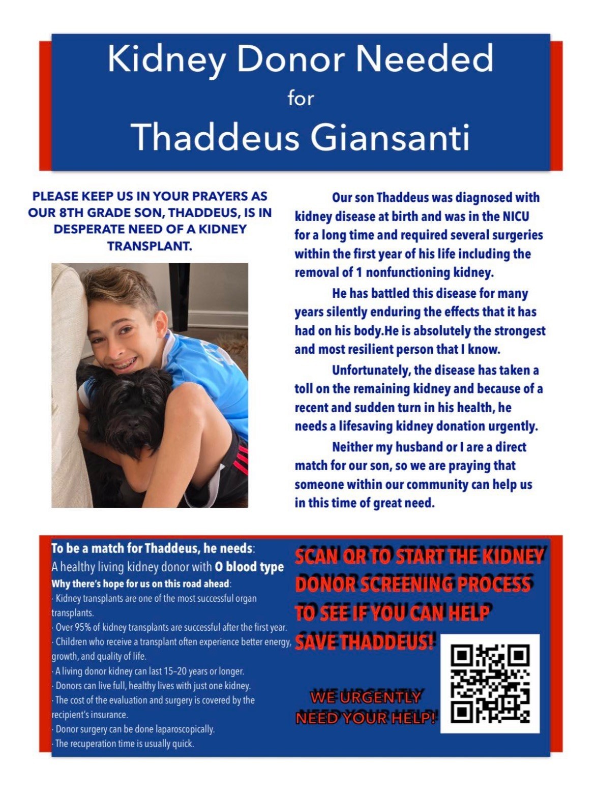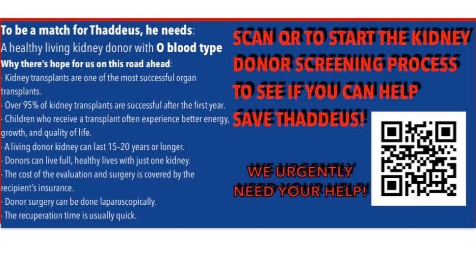 Below you can find more information on Thaddeus’ circumstances, and a QR code that takes you to a site through Children’s Hospital of Philadelphia to see if you might be a match.