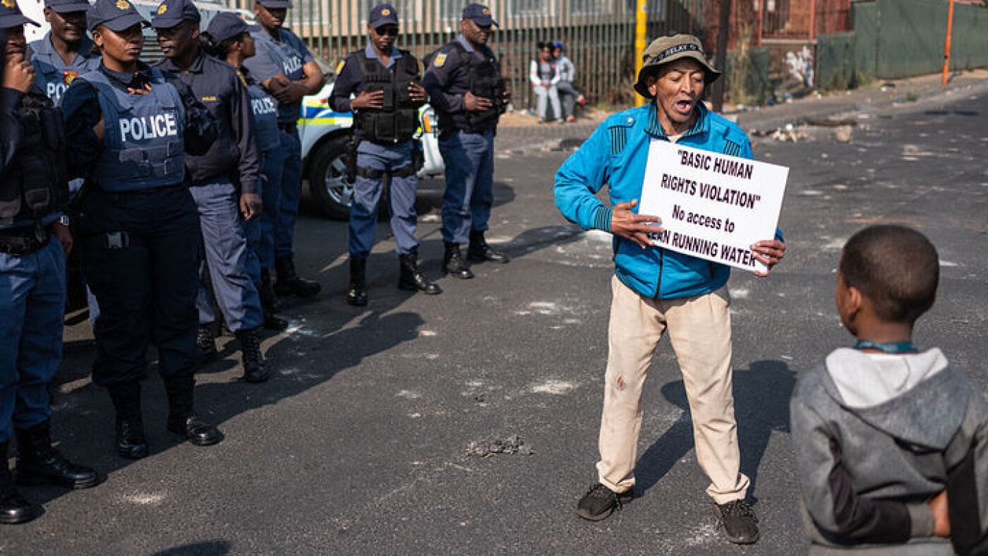 Residents hold placards and chant as they gather during a protest over water cuts in Johannesburg.