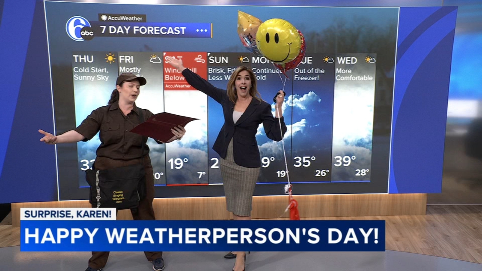 Action News Mornings surprised Meteorologist Karen Rogers with a singing telegram to celebrate National Weatherperson’s Day!
