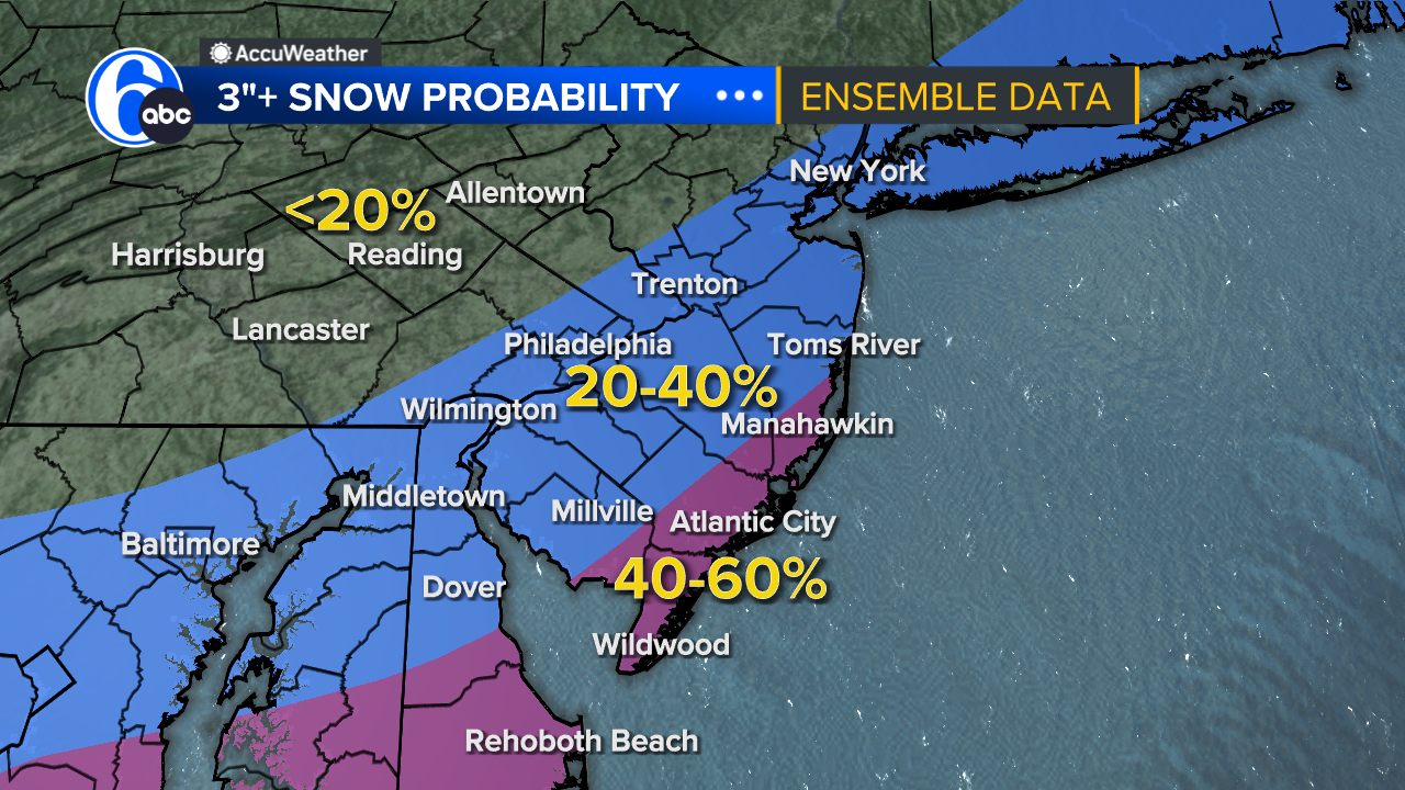 As it stands now, a blend of the GFS and Euro models shows about a 40-60% chance of 3 inches or more of snow for the Delaware beaches and the Jersey Shore. That number drops to near 20% for the I-95 corridor, suggesting a 3-inch snowfall is not likely for Philadelphia at this point.