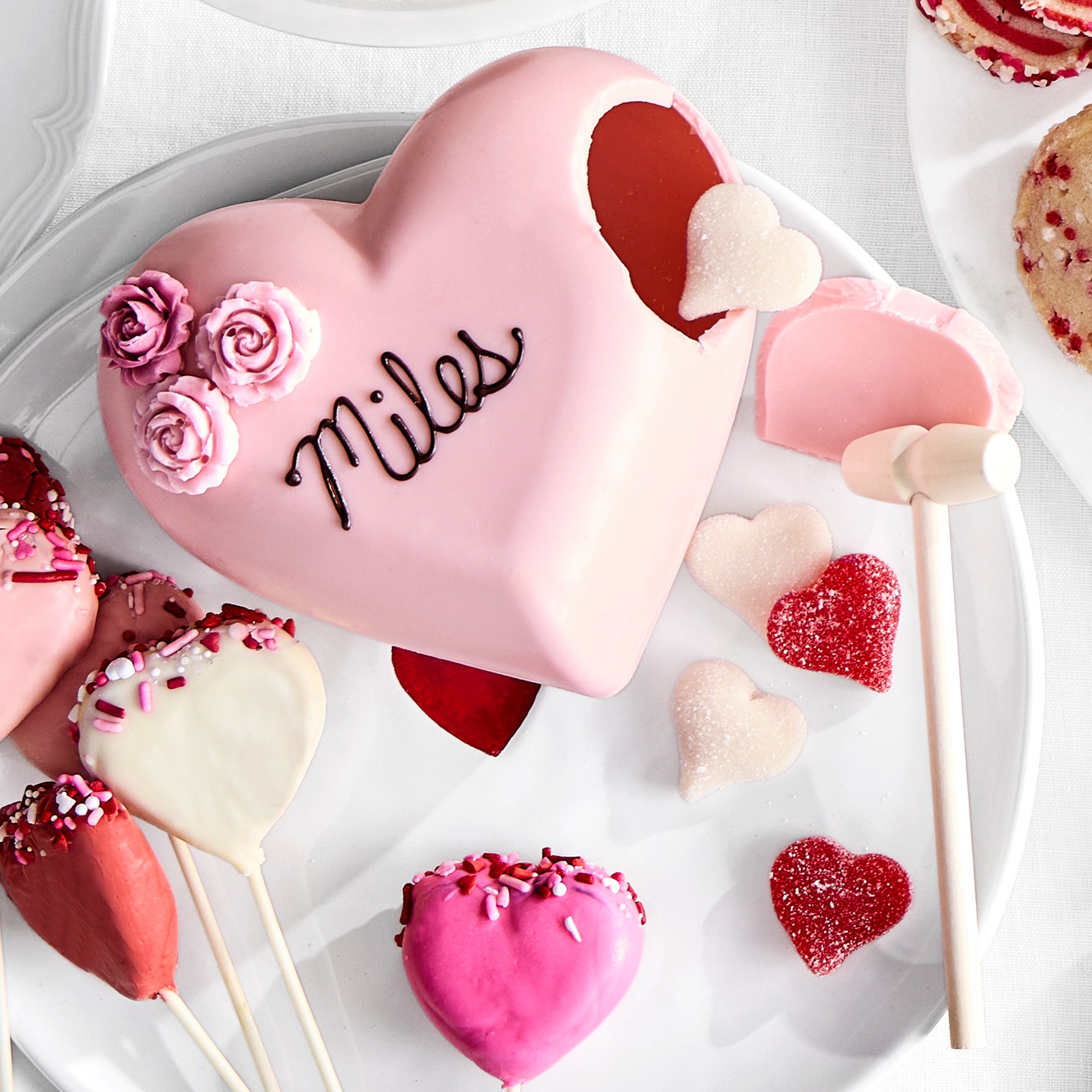 A personalized gift shows you planned ahead for the occasion. This pink heart-shaped breakable chocolate treat is eye-catching and delicious. Add her name to it. After your Valentine snaps a few photos of the edible heart, she can dig in and enjoy your sweet gift. It comes with a wooden mallet for cracking it open.